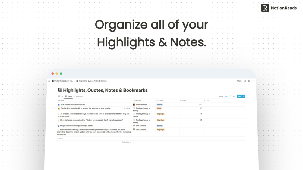 NotionReads comes with a built-in note-taking feature. Save highlights, notes, quotes, and more and easily find them later.